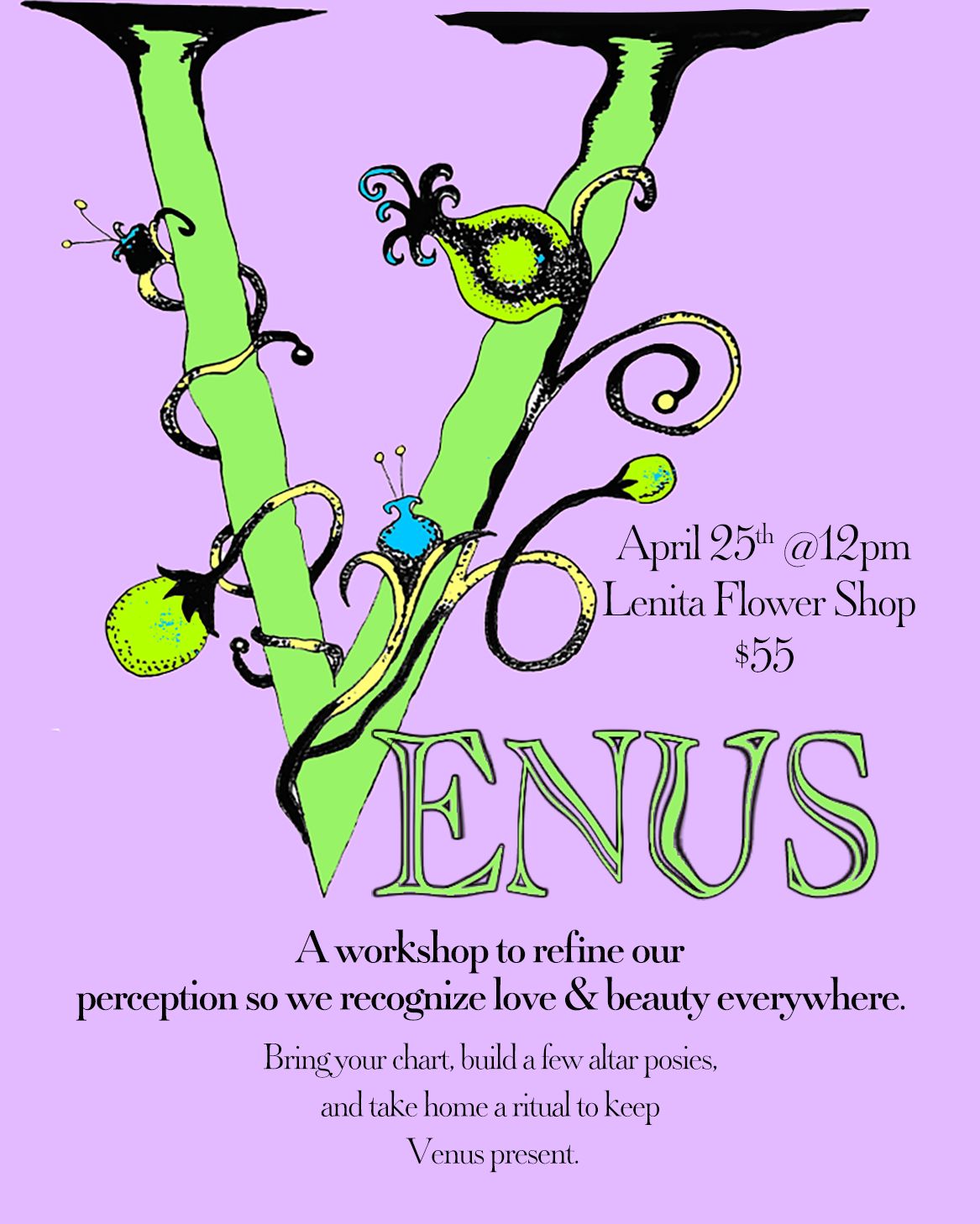 We’ll be working with Venus as a lens for attention, preference, and presence — something we practice directly through sensing and awareness. We’ll look at our natal charts, build a few altar posies and take home a physical ritual to work with future Venus transits.